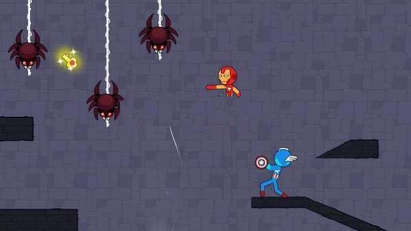 1、游戏采用直观的箭头操控方式,玩家需要同时指挥红色和蓝色火柴人移动。两个角色各有弱点:红色怕水,蓝色惧火,必须巧妙避开各自的天敌才能安全前进。