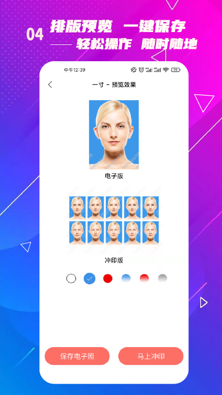 软件支持自拍模式,您可以反复拍摄直到满意为止。内置强大的美颜功能,可以一键优化肤色、修饰面部细节,让证件照更加精致。我们还提供男女正装模板,可以快速为照片添加专业着装。更换背景色只需一键操作,支持红、蓝、白等多种底色切换,操作简单快捷。更有冲印服务可选,支持快速打印并包邮到家。