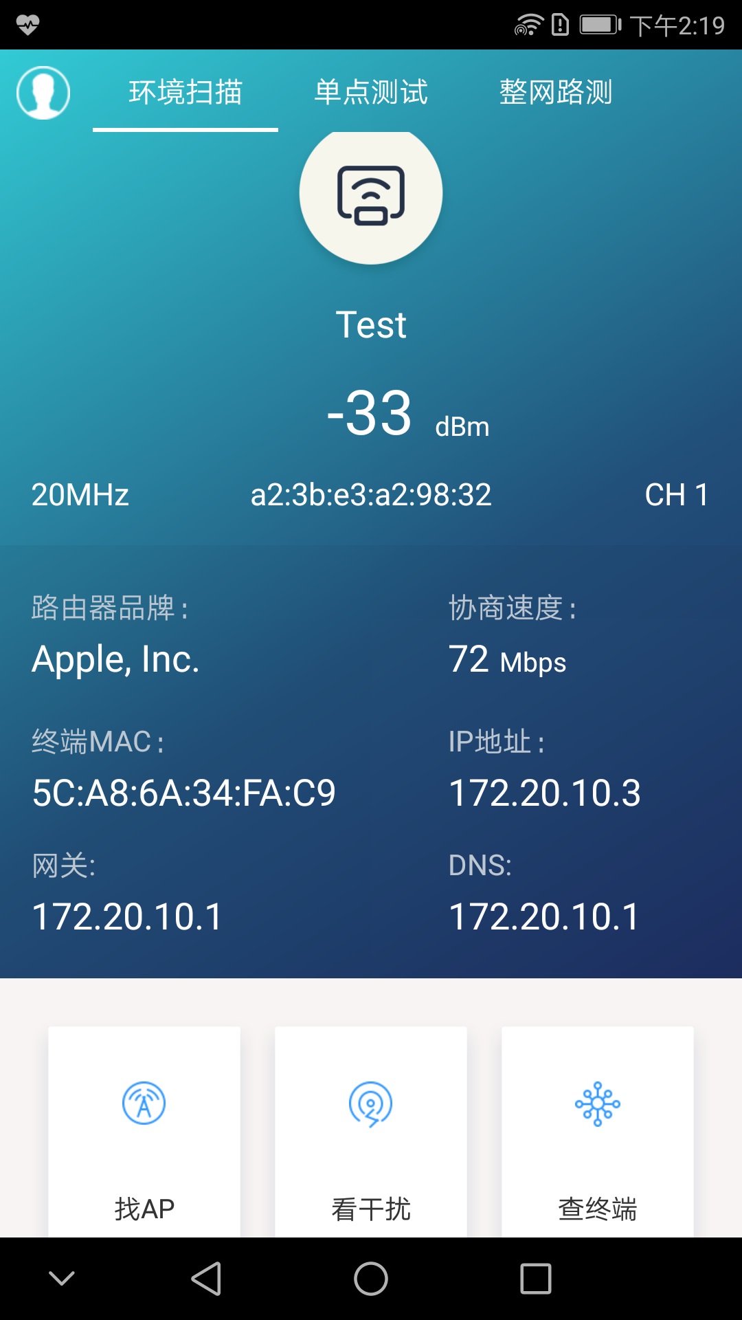 1.环境扫描:全面检测当前连接WiFi信号的各项参数,包括信号强度、频宽、信道占用率等专业数据。支持查找接入点(AP)、分析干扰源、查看连接终端设备等实用功能,帮助用户快速定位网络问题。