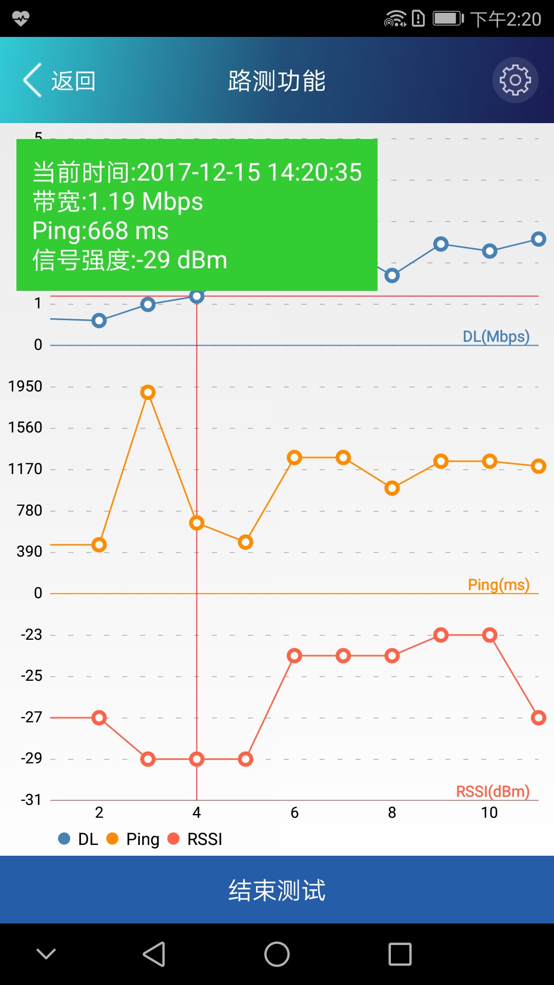 4.路测功能:创新的移动测试模式,可实时记录网络上下行带宽、延迟、信号强度等参数随时间的变化。支持在地图上任意拖动查看历史记录轨迹,特别适合无线网络覆盖优化和故障排查。
