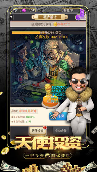 《大亨也疯狂》是一款令人欲罢不能的模拟经营策略手游,让玩家体验从零开始打造商业帝国的快感。在这里,你可以自由经营各类产业,进行多元化投资,见证财富指数级增长的奇迹。游戏采用轻松休闲的放置玩法,完美适配现代人碎片化时间需求。无论是想体验一夜暴富的刺激,还是享受长期经营的成就感,这款游戏都能满足你的需求。独特的商业模拟系统、丰富的经营策略和幽默诙谐的游戏风格,将带给你前所未有的财富积累体验。