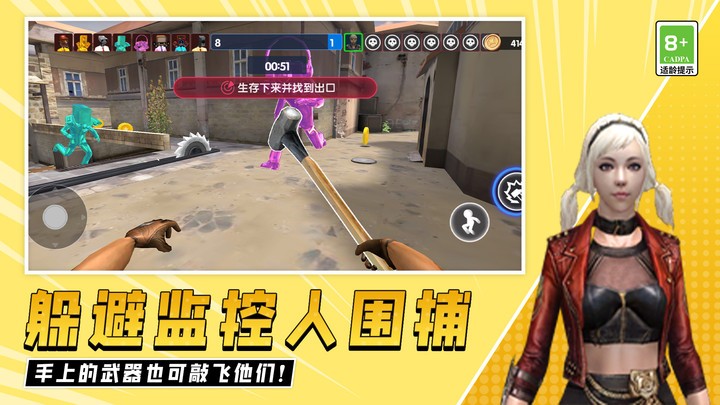 3、躲避监控人围捕,手上的武器也可敲飞他们。近战反击系统让逃亡者也有反抗能力,但要注意武器耐久度限制。