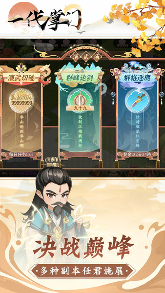 一代掌门是一款充满江湖气息的大型经营模拟手游,在这里你将化身一位肩负复兴使命的掌门人。游戏采用精美3D画面打造出波澜壮阔的武侠世界,玩家可以自由建设门派、打造神兵利器、招募武林豪杰。通过经营商铺、参加武林大会、探索秘境等丰富玩法,体验从没落门派到武林至尊的成长历程。独特的装备打造系统和连招战斗玩法,配合海量随机事件和社交互动,为你带来前所未有的武侠经营体验!