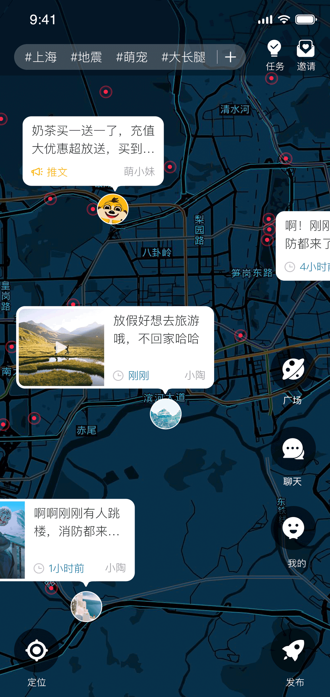 【地图寻宝】用户发布的每条动态都会生成随机金额红包,其他用户可通过地图探索功能发现并领取,平台每日发放总金额超过22.22万元现金红包,让社交互动更有趣味性。