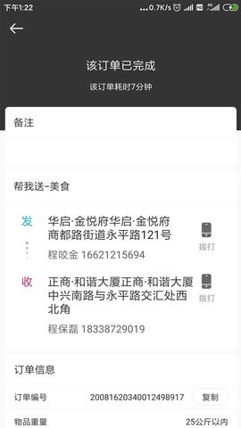 5、点击订单,可以查看订单的详细信息。订单详情页包含完整的配送信息、客户备注、商家联系方式等重要内容。