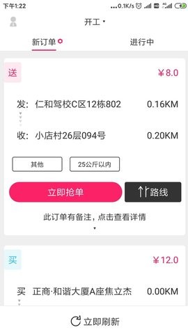 2、用户可以看到各个订单的详细取货和收货地址,并且可以快速查看路线;内置智能导航系统,自动规划最优路线,节省配送时间,提高接单效率。