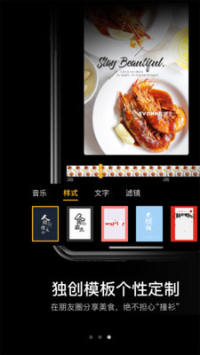 3、独创模板个性定制:支持自定义滤镜、贴纸和文字,确保你的美食分享在朋友圈独树一帜,绝不雷同。
