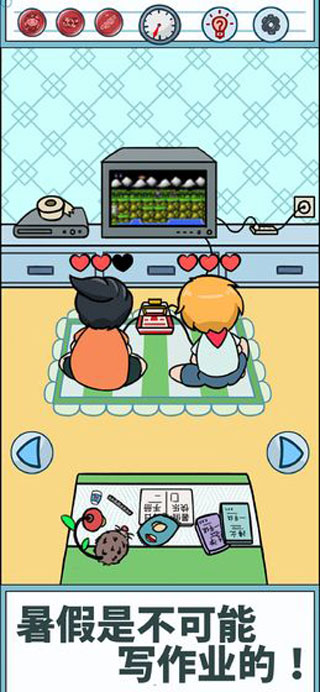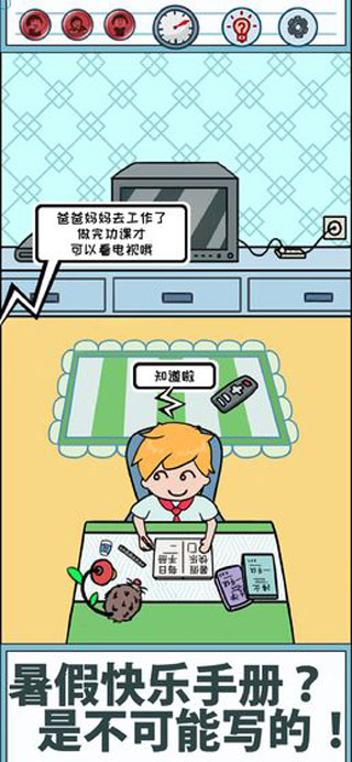暑假是不可能写作业的是一款充满创意与趣味的休闲益智手游,游戏以清新简约的卡通画风,生动再现了学生们面对暑假作业时的各种小心思。随着六月中旬的到来,紧张的期末考试结束后,学生们即将迎来期盼已久的暑假。然而堆积如山的假期作业却让快乐打了折扣。在这款游戏中,玩家将化身为机智的主角Jo鲁诺·小黄毛,通过巧妙利用场景中的物品和资源,想方设法逃避写作业的烦恼。游戏设计了丰富多样的关卡和脑洞大开的解谜玩法,让玩家在轻松愉快的氛围中体验"斗智斗勇"的乐趣。每个关卡都充满惊喜和挑战,考验着玩家的观察力和创造力。你能成功完成所有挑战,享受一个无忧无虑的暑假吗?