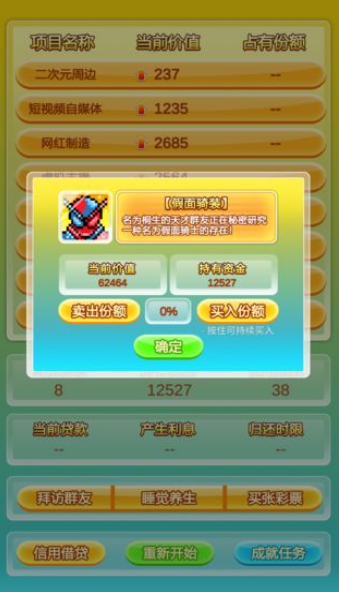 1、动态市场引擎会随机生成投资风口,从新兴科技到传统行业,每个领域都需要独特的投资策略。2、可视化财富报表系统将抽象的数字转化为直观的图表,你的每笔交易都能生成专业级的K线分析。3、智能投顾助手会基于大数据给出投资建议,但最终决策权始终在你手中。游戏还创新性地加入了资产组合功能,让玩家可以像专业基金经理那样构建多元化投资组合。