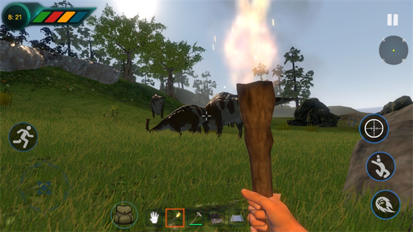 3、游戏玩法非常,画面中左上角绿色代表体力值、红色代表血量、橙色代表饥饿度、蓝色代表口渴值。这些生存指标会随着时间推移和环境变化而改变,玩家需要通过狩猎、采集、建造等方式来维持生存。游戏还设有详细的教程系统,帮助新手玩家快速掌握各项生存技巧。