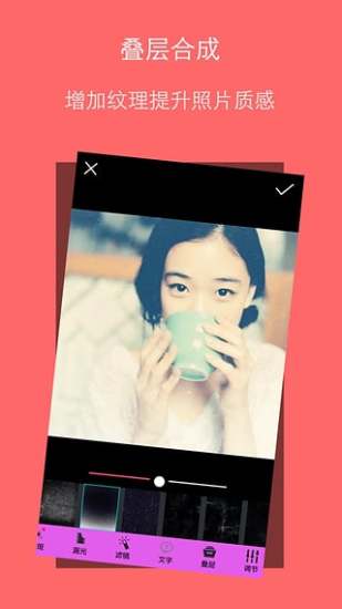 【叠层合成】内置大量精美纹理和艺术叠加层,通过智能混合模式让照片瞬间提升质感,创造出独特的视觉冲击力和高级感。