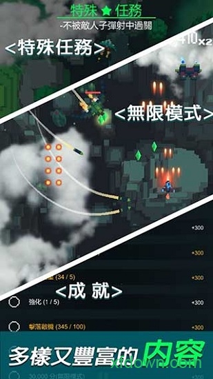 4、丰富多样的战机。多达20多种的像素战机等你解锁挑选,每种战机的技能属性都不相同。从二战经典机型到科幻未来战机,满足各类玩家的收藏欲望。