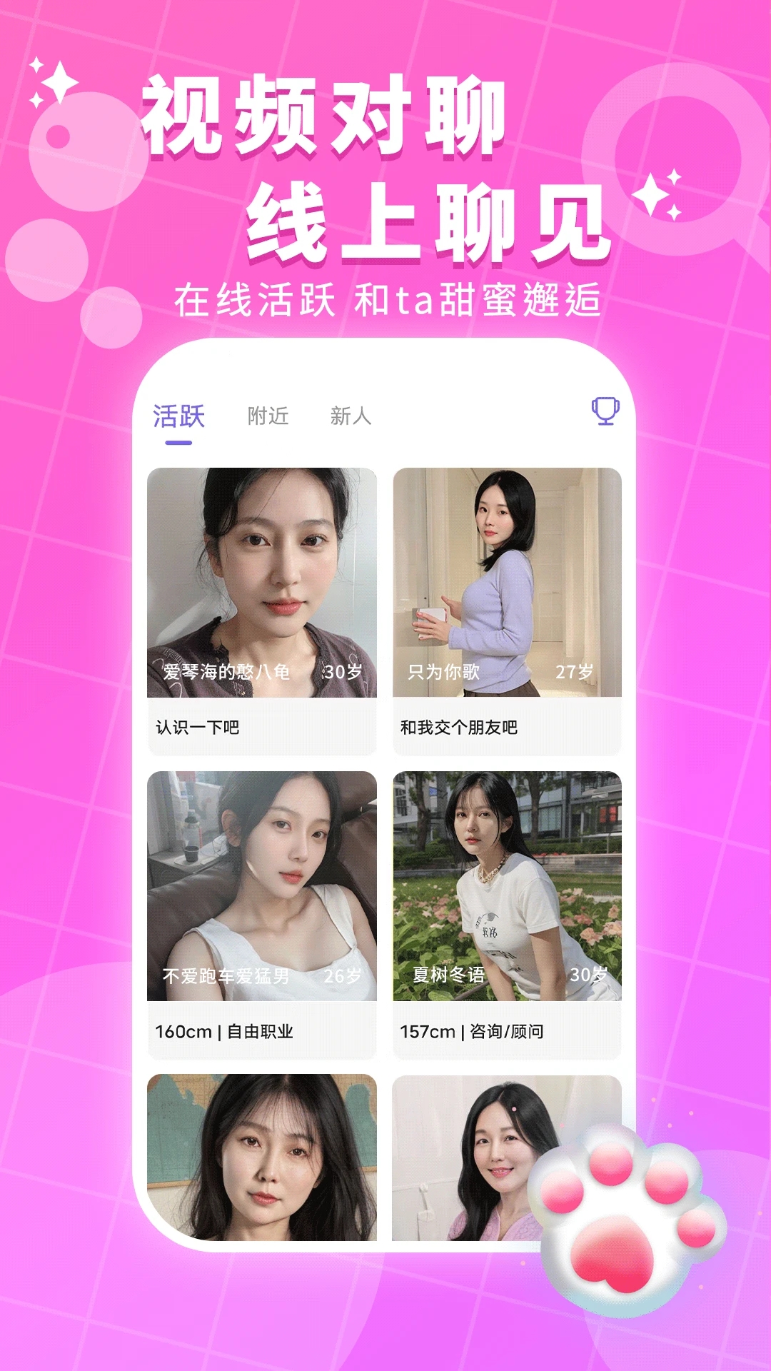 本次更新主要优化了用户体验,修复了若干影响使用的bug。改进了视频通话的稳定性,提升了画面清晰度。新增了多种个性化表情包,让聊天更有趣。同时增强了系统安全性,进一步保护用户隐私。我们还根据用户反馈调整了匹配算法,使推荐结果更精准。