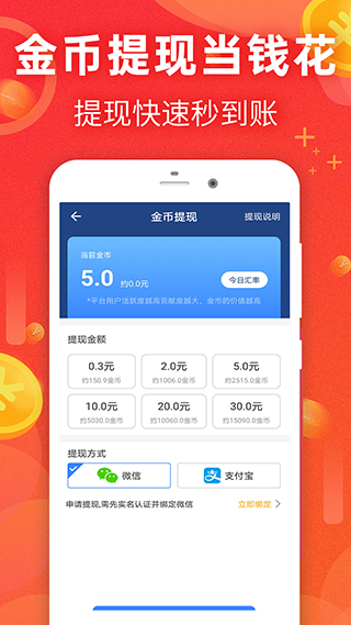 5、提现操作简单快捷,在钱包页面选择提现金额和到账方式,0.1元起提无手续费,最快30秒即可到账微信或支付宝。