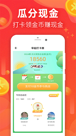 3、晨起打卡挑战赛邀您参与,与全国用户同台竞技,完成步数目标即可瓜分万元奖池,还有额外成就奖励等您来拿。