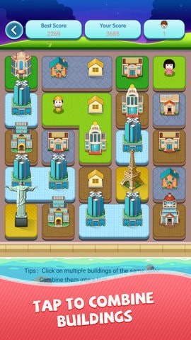 2、游戏的玩法非常简单,游戏可以将相同颜色的建筑进行合并升级,这种独特的合成机制让游戏充满策略性。你需要合理规划建筑布局,才能实现最高效的升级路径,最终打造出令人惊叹的建筑群。