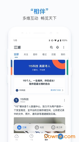 115个人官方版是一款功能全面、操作便捷的云存储应用,致力于为用户提供高效的数据管理解决方案。无论是工作文件、生活照片还是重要文档,都能通过这款软件实现安全存储与快速访问。其跨平台特性让用户无论身处何地,只需一部手机即可轻松管理云端数据。软件界面简洁直观,即使是初次使用者也能快速上手。除了基础的存储功能外,115个人还整合了社交互动、求职招聘等特色服务,真正实现了"一站式"数字生活体验。十年技术沉淀使其在数据安全性和稳定性方面表现优异,是值得信赖的个人数据管家。
