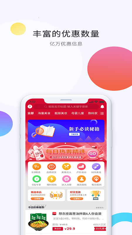 1、优惠券:平台整合了百万级优惠券资源库,涵盖各大电商平台的购物券、红包等优惠形式,用户购物前搜索一下,轻松省下一大笔钱。