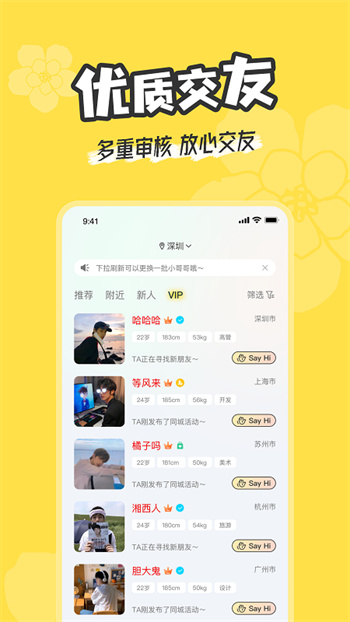 1. 智能匹配:基于用户画像和行为的精准推荐算法,提高交友成功率。 2. 多种互动:支持文字、语音、视频等多种交流方式,满足不同用户需求。 3. 安全可靠:严格的实名认证和举报机制,保障用户交友安全。 4. 本地化社交:专注于同城交友,让约会更方便快捷。 5. 动态分享:用户可以发布生活动态,展示个人魅力,吸引更多关注。 6. 活动丰富:定期组织线上线下活动,帮助用户打破社交壁垒。