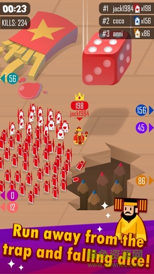 国王快跑创新性地将卡牌策略与多人竞技完美结合,玩家将操控扑克国王在动态生成的地图中展开冒险。游戏不仅延续了经典io游戏的吞噬成长机制,更创新加入卡牌合成系统——每收集10张同花色路人卡牌即可解锁特殊技能。地图中随机刷新的宝箱可能开出稀有道具,但也要当心突然出现的黑洞陷阱。随着段位提升,玩家还能解锁皇家锦标赛模式,与全球玩家争夺扑克王座。每日轮换的特殊主题地图,让每次冒险都充满新鲜感。