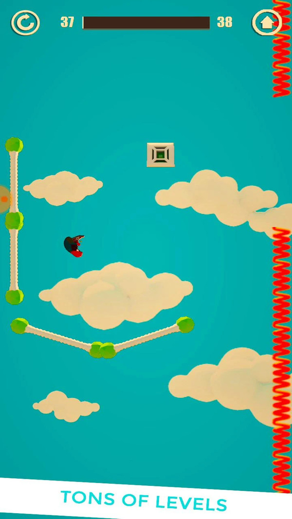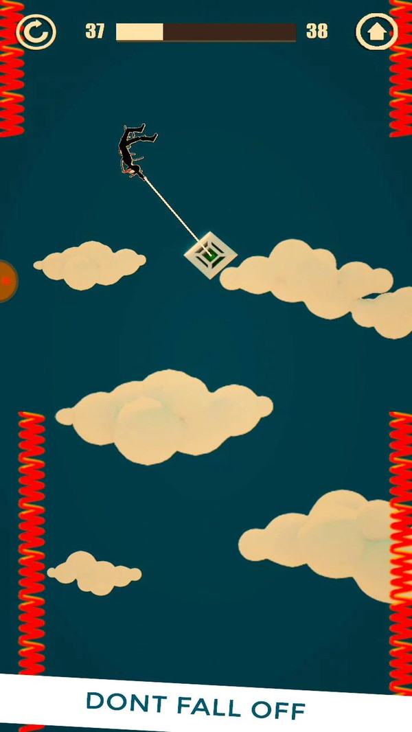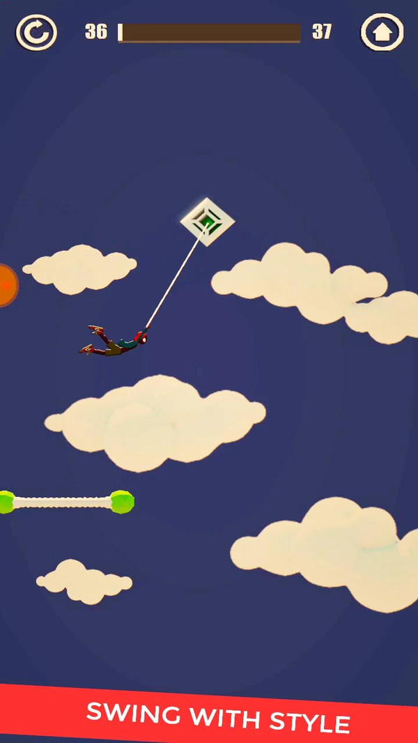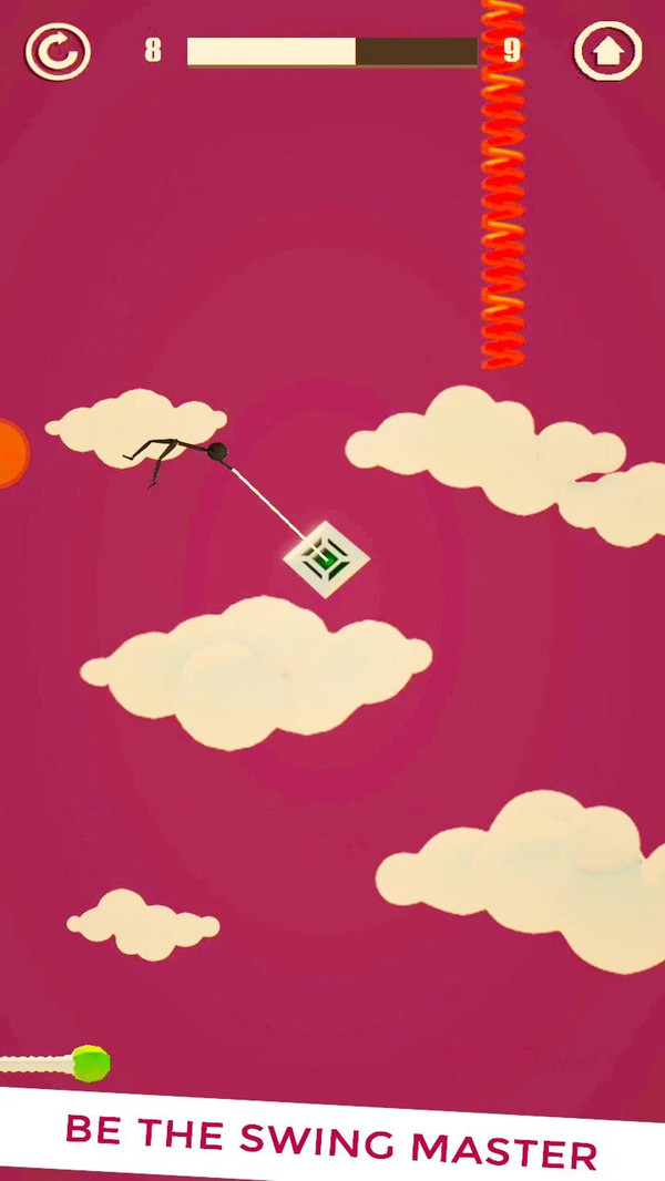 1、采用精美的动画风格场景设计,每个关卡都有独特的视觉主题,搭配新颖的物理摆荡玩法;2、精准把握跳跃时机和节奏是关键,玩家需要根据绳索长度和平台距离调整摆荡力度;3、收集散落在关卡中的金币和特殊道具,这些道具能提供临时加速、无敌等增益效果;4、轻松欢快的背景音乐与游戏节奏完美契合,营造出沉浸式的游戏体验;5、支持自定义角色外观,打造属于你的独特火柴人形象。