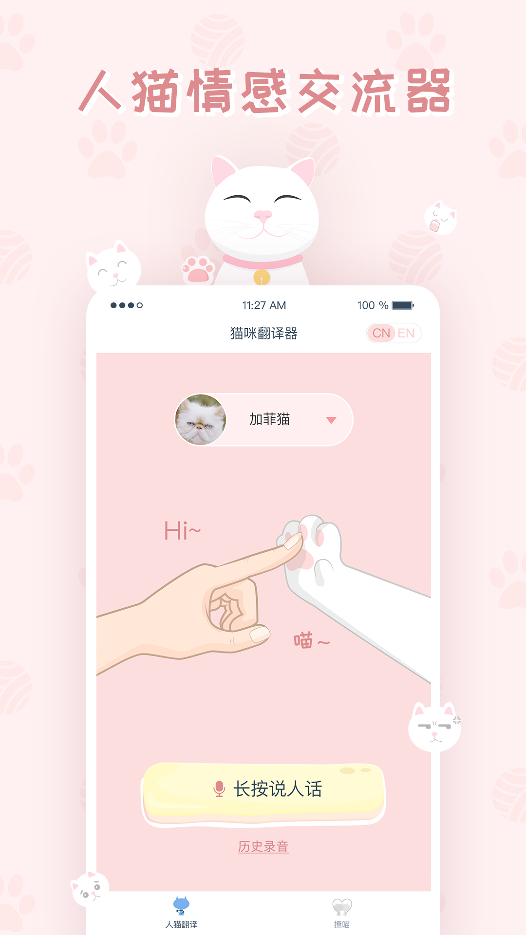 你是否曾好奇过自家猫咪的喵喵声背后隐藏着什么秘密?《猫咪翻译器》将为你打开一扇通往喵星人内心世界的神奇大门。这款创新应用通过先进的语音识别技术,实现了人类与猫咪之间的双向交流。它能实时翻译猫咪的叫声,让你准确理解爱宠的需求和情绪;同时也能将你的话语转换成猫咪能理解的"喵星语",让沟通不再有障碍。无论是日常互动、安抚情绪还是增进感情,这款应用都能成为你和猫咪之间的最佳桥梁,让你们的相处更加默契有趣。