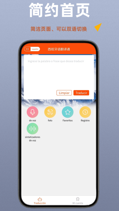 2.主界面选择"文字翻译"功能,输入需要翻译的中文或西班牙语文本,点击翻译按钮。系统支持长文本翻译,最大可输入5000字,满足不同场景需求。