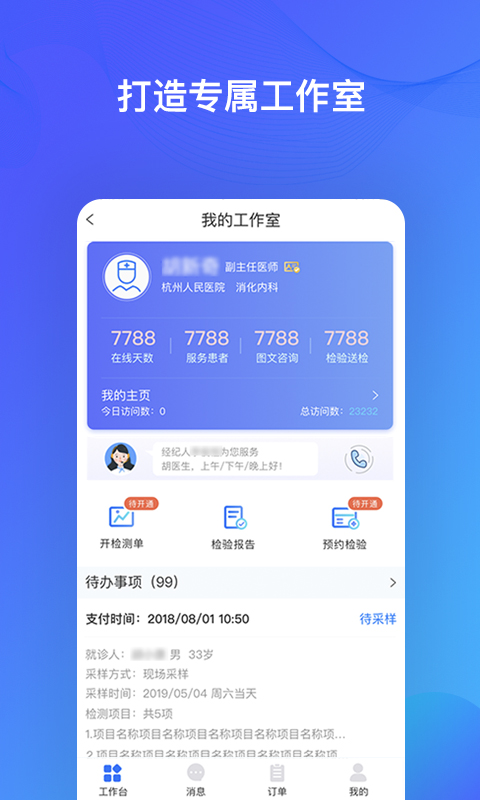 2、通过互联网+医学检验,为医生搭建专属移动工作室。工作室提供完善的患者管理功能,包括智能分组、个性化标签、病历完善、健康随访和即时通讯等工具。咨询服务模块支持1对1图文问诊,医生可灵活设置在线时间,实现工作生活平衡。检验检查服务实现全流程数字化,患者线上预约后,系统自动匹配最优采样方案,检测报告实时推送至医生端,支持一键下载、专业解读和诊断意见出具,大幅提升医生工作效率。