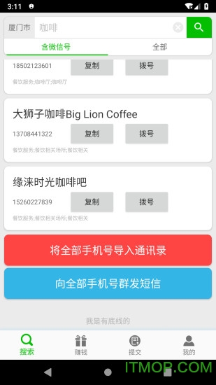 3.页面底部提供一键导入功能,可将所有搜索到的手机号码批量保存至手机通讯录。系统会自动去重处理,避免重复保存相同联系人。