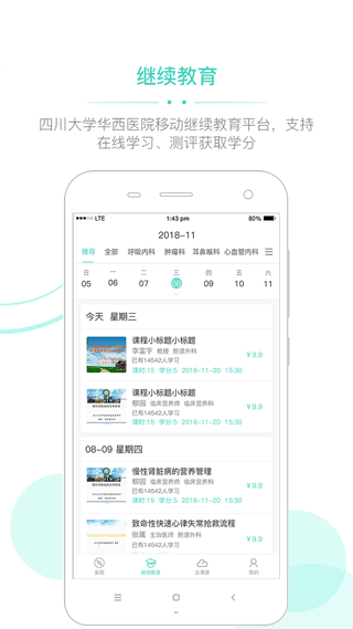 3、继续教育:作为四川省卫健委认证的继续教育平台,提供100+门 accredited 课程,学习进度实时同步至个人学分档案,结业证书电子版一键下载。