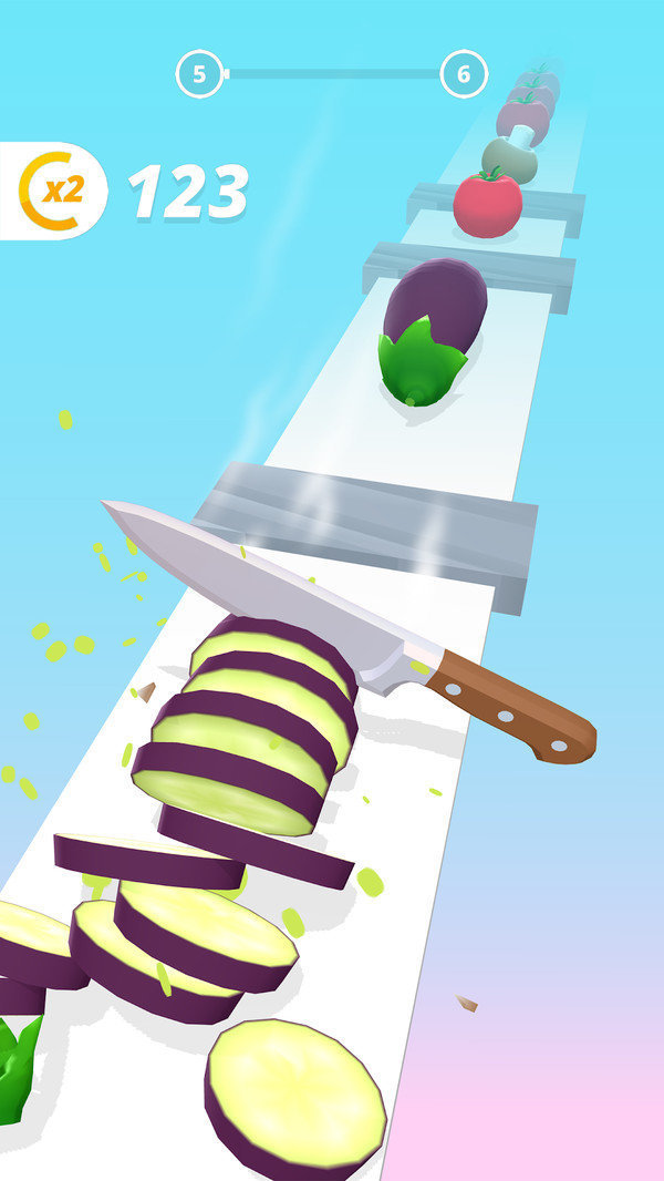 1、游戏采用清新简约的艺术风格,色彩明快而不刺眼,界面设计直观友好。各种食材和刀具的建模精细,切割特效流畅自然,整体视觉效果令人赏心悦目。