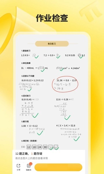 安装好小猿口算app后,对着习题册点击「拍照检查」按钮,小猿口算App就会自动识别练习册中的算术题,并且马上给出答案,对错一目了然。系统采用智能图像处理技术,即使在光线不佳或角度倾斜的情况下,也能保持很高的识别准确率。
