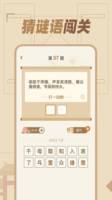 在猜谜过程中,玩家需要认真思考并运用逻辑推理能力,才能答对题目并获得奖励。游戏中的谜题种类繁多,每次闯关都会遇到不同的题目,确保玩家始终保持新鲜感。谜语答案各不相同,挑战性十足,适合喜欢动脑的玩家长期体验。