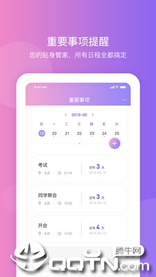 3重要事项提醒:贴身管家式的记录提醒,保障您的每一个行程安排;可设置重复提醒,适合定期会议或活动。