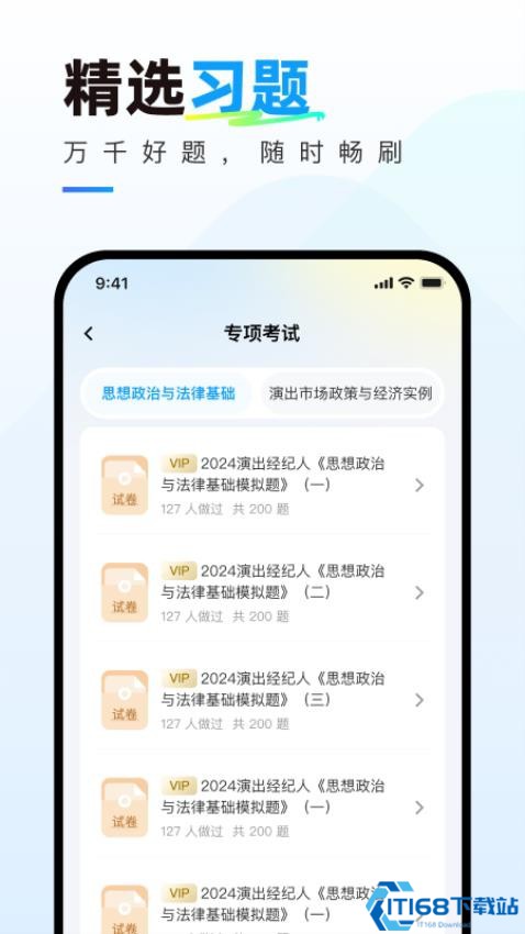 《演出经纪人真题库》是一款专为演出经纪人资格考试打造的备考学习软件,拥有海量题库资源和专业名师讲解。用户可以通过在线测试快速定位薄弱环节,有针对性地提升知识水平。软件涵盖考试全部重要知识点,并提供免费学习资源,帮助考生高效备考。无论是章节练习、历年真题还是押题密卷,都能为用户提供全面系统的学习体验,是备考路上的得力助手。