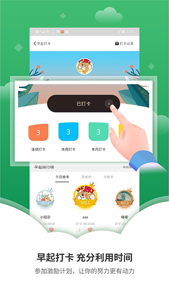 早起打卡系统设有全国排行榜,激励用户养成良好作息。每次打卡都能获得积分奖励,积累一定数量可兑换实用奖品。系统会统计连续早起天数,形成可视化数据报告。社区内可以看到其他用户的打卡动态,互相督促共同进步。特别设计的唤醒提醒功能,帮助克服赖床习惯。