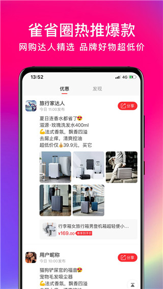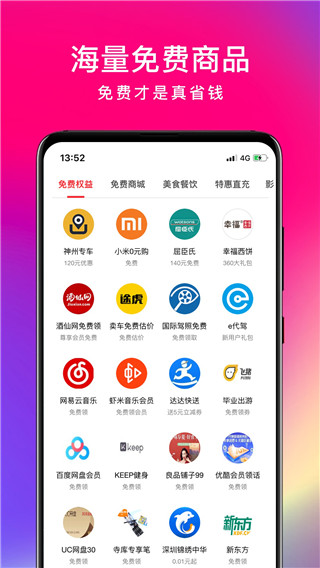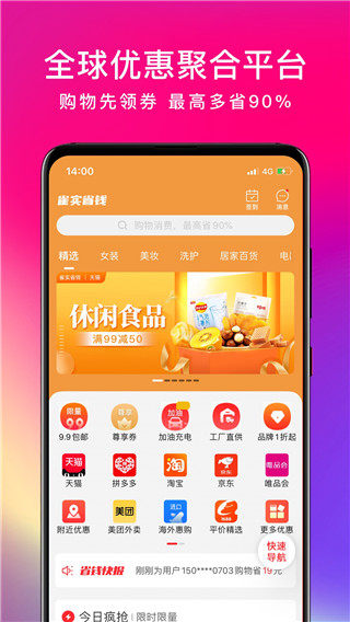 2、多:头部平台多,精选1000+电商、外卖、出行、娱乐、美食、酒店、票务。覆盖淘宝、京东、美团、饿了么等主流平台,吃喝玩乐购一应俱全,满足用户全方位的省钱需求。