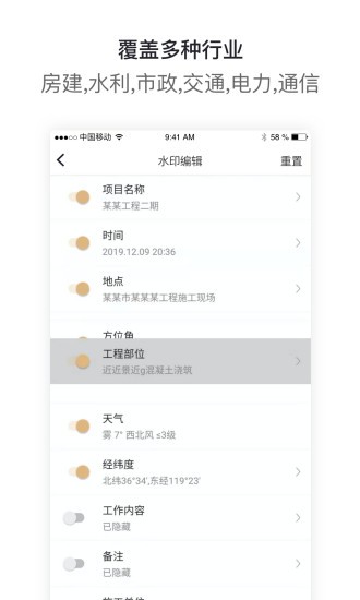 2.使用场景十分的多,房建、水利、市政、交通以及广告等工程。特别针对不同工程类型开发了专属功能模块,如水利工程的汛期记录模式。