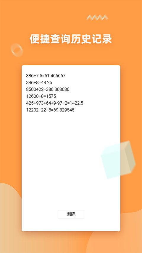 2、历史记录功能,计算过程和结果完整记录,方便找回查看,最多可保存100条历史记录;