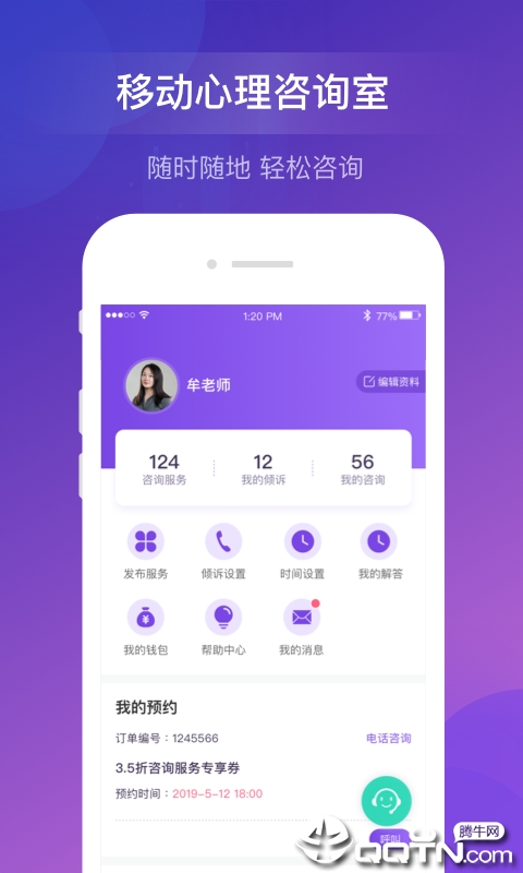 【心理咨询工作】咨询师可以在平台上完善个人信息,灵活安排咨询时间,高效管理订单,并通过文字、语音或视频形式为来访者提供专业的心理支持。平台还支持订单状态实时更新,方便咨询师随时掌握工作进度。
