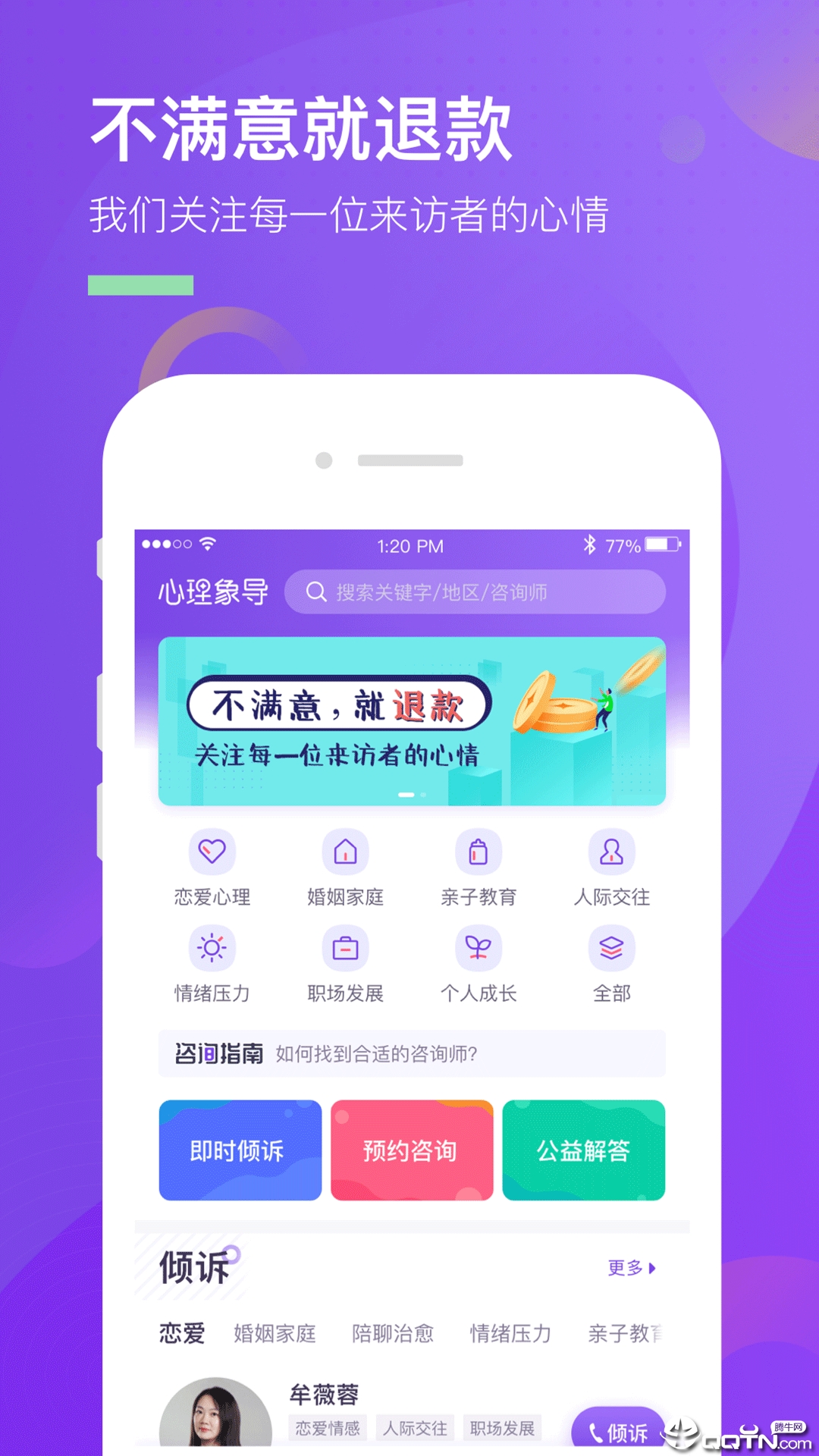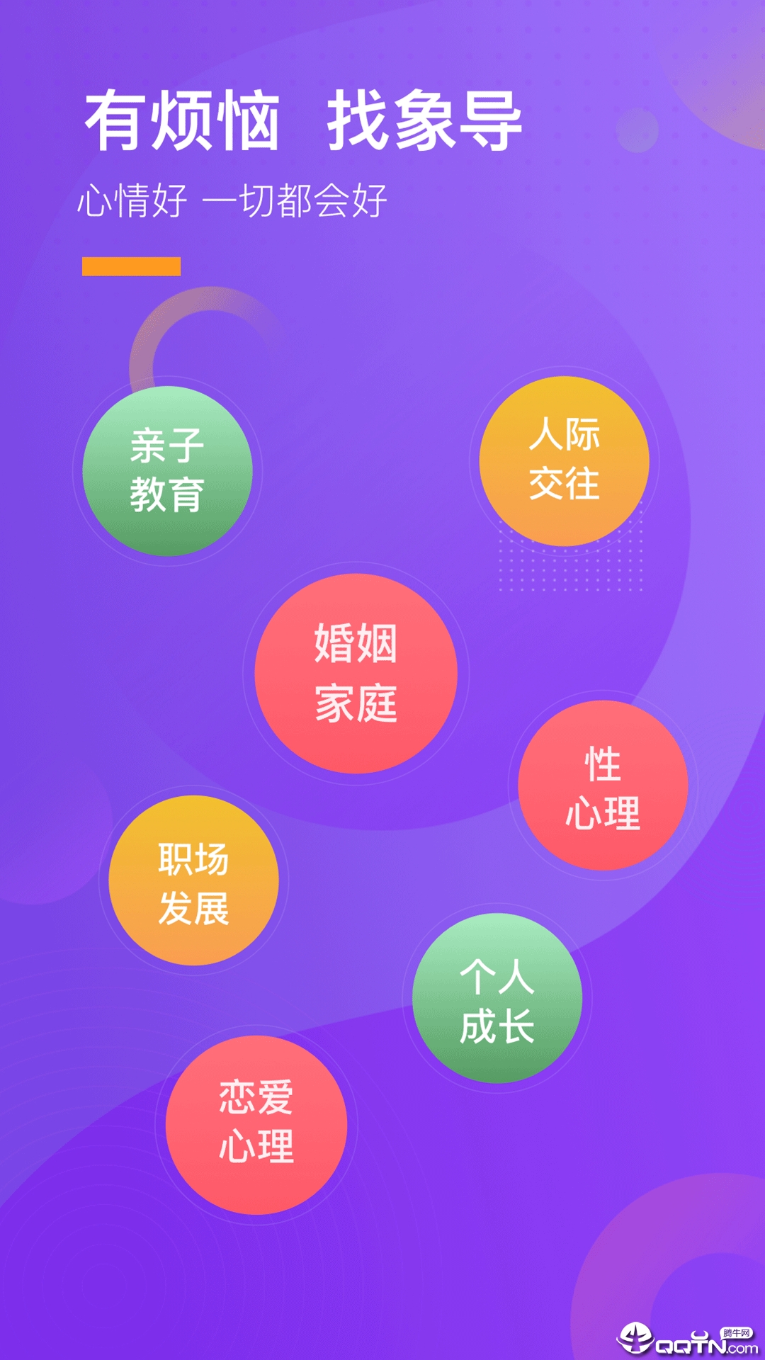 心理象导app是一款专注于心理健康服务的专业平台,致力于为用户提供便捷、高效的心理咨询与疏导服务。在这里,您可以随时倾诉内心的烦恼与困惑,获得专业心理咨询师的在线解答与情感支持。无论是婚姻家庭、职场压力,还是情绪管理、亲子关系等问题,都能找到匹配的解决方案。通过线上与线下相结合的模式,心理象导让心理服务更加触手可及,帮助用户拨开内心阴霾,重拾生活希望。立即下载体验,开启您的心理健康之旅!