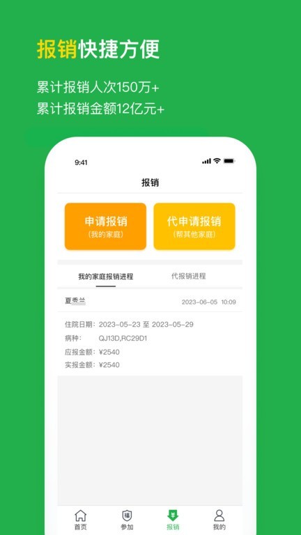 2、点击"申请报销"即可进入智能引导流程,系统会根据住院类型自动匹配最佳报销方案,支持人脸识别快速验证身份。