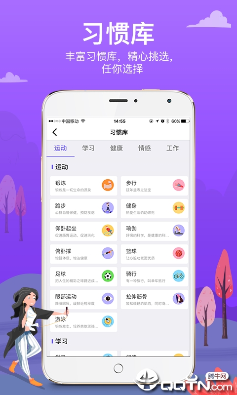习惯库:内置上百种精选习惯模板,涵盖健康生活、学习成长、工作效率等多个维度。无论是想培养阅读习惯还是健身计划,都能在这里找到合适的起点,让习惯养成更有方向性。