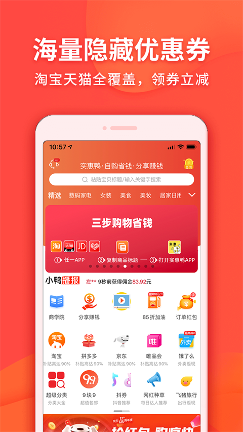 实惠鸭App是一款专为网购达人打造的省钱利器,汇聚了淘宝、拼多多等主流电商平台的优质商品和隐藏优惠券。在这里,您不仅能以超低价格购买到心仪商品,还能通过邀请好友赚取额外佣金。平台每日精选9.9元包邮好物,提供大额优惠券和超高返利,让您享受前所未有的省钱体验。无论是日常购物还是大牌折扣,实惠鸭都能帮您轻松省钱,真正实现"买得越多省得越多"的购物理念。