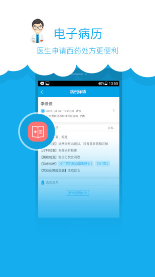 药事服务:医生在医享家app上进行诊疗服务过程中,可根据病人检查检验结果进行诊断,并在线开具相应的医嘱信息,生成对应的电子处方,电子处方单由执业药师审核,保障每一张电子处方的可靠性,对有需要的患者还可以进行用药指导。系统内置药品数据库,支持智能配伍禁忌检查,避免用药风险。处方流转功能可直接对接合作药房,实现药品配送上门服务。