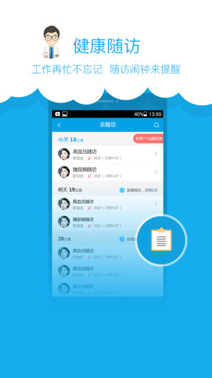 健康管理:医生可对用户在检测、评估、干预、跟踪等四大核心环节提供全流程的专业健康管理服务。平台支持健康数据监测,可接入各类智能穿戴设备;风险评估系统能自动生成健康报告;干预方案库提供多种健康管理模板;随访功能支持定期提醒和效果评估。医生可以为慢性病患者制定个性化管理计划,实现长期健康监护。