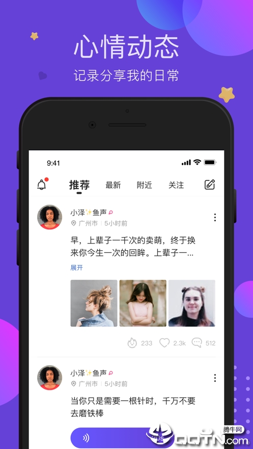 声鉴:心随声动,声控福利。这款App专为声音爱好者打造,让你在旋律与对话中发现声音的无限魅力。轻听你哼唱的情歌,回味你暖声的情话,每个音符都承载着独特的情感表达。平台上的用户个性鲜明,时而孤傲霸道如总裁,时而柔情腼腆似少年;时而刁蛮任性像公主,时而呆萌可爱若宠物。在这里,声音就是最好的名片,有趣的灵魂与动听的声线碰撞,擦出不一样的火花。快来声鉴寻找你的声音知己,开启一段"声"而不凡的社交体验吧!