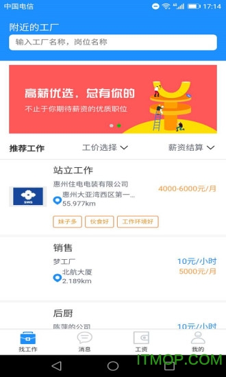 【搜索职位】在"更多搜索条件"内选择行业、职能,更精准的定位你想要的好职位。平台支持按薪资范围(日结/月结)、食宿条件、班制类型等20余项细化筛选,特别新增急招岗位专区,标注有"闪电入职"标识的职位可享优先面试权。
