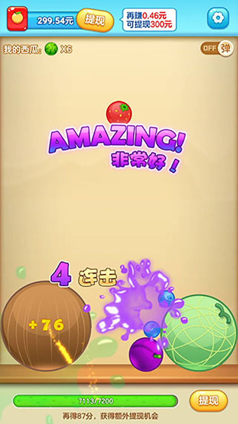 2、游戏最具特色的玩法是通过不断合成使水果升级,最终合成巨型西瓜。每个等级的西瓜都有对应的积分价值,玩家可以将积分兑换成现金红包。随着西瓜等级提升,获得的红包金额也会相应增加,让玩家获得实实在在的收益。