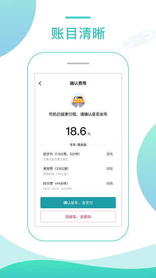 4、透明计价系统:采用智能计费方式,根据实际里程和时间计算费用,杜绝乱收费现象。